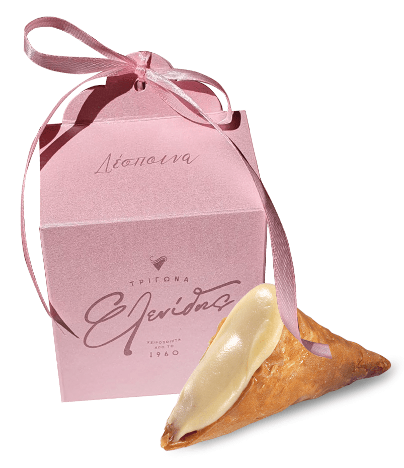 Μοιράζοντας γάλα μέχρι τότε και φτιάχνοντας ρυζόγαλα και κρέμες που κέρδισαν την αγάπη του κόσμου, προχώρησε ένα βήμα παραπάνω: Ξεκίνησε, το 1956, να φτιάχνει γλυκίσματα από φύλλο κρούστας που τα γέμιζε με κρέμα δικής του έμπνευσης. Το φύλλο ήταν χειροποίητο, τα υλικά διαλεχτά, η συνταγή μοναδική και ο Γιάννης Ελενίδης πρόσθεσε το μεράκι του δημιουργώντας το τρίγωνο που αγαπήθηκε απ’ όλους και απέκτησε φήμη που σύντομα ταξίδεψε σε ολόκληρη την Ελλάδα.